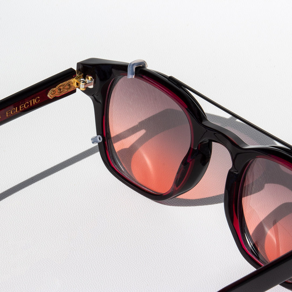 L’estetica del modello ECLECTIC è assolutamente distintiva e resa ancora più audace dai dettagli in metallo e l'acetato bicolore scelto.