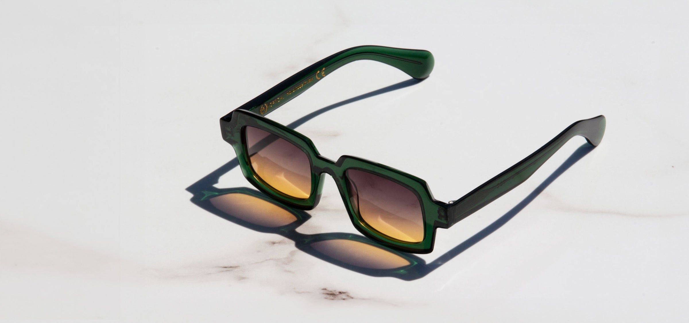 Gli occhiali da sole della collezione Bold di H|Optical™ sono realizzati a mano utilizzando un unica lastra di acetato di cellulosa spessorato.
